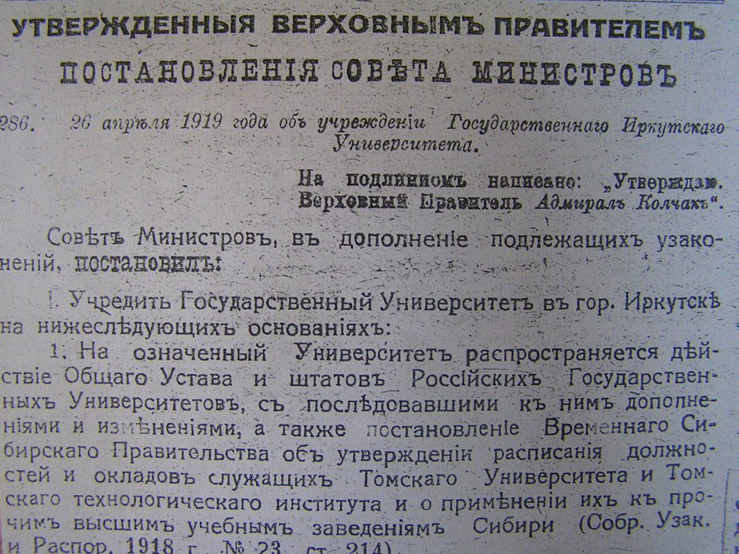 Первым официальным документом «Об учреждении Иркутского Университета» стало постановление Совета министров от 26 апреля 1919 г., подписанное Верховным правителем А. В. Колчаком. К этому времени университет фактически уже существовал более полугода. Его открытие состоялось 27 октября 1918 г.