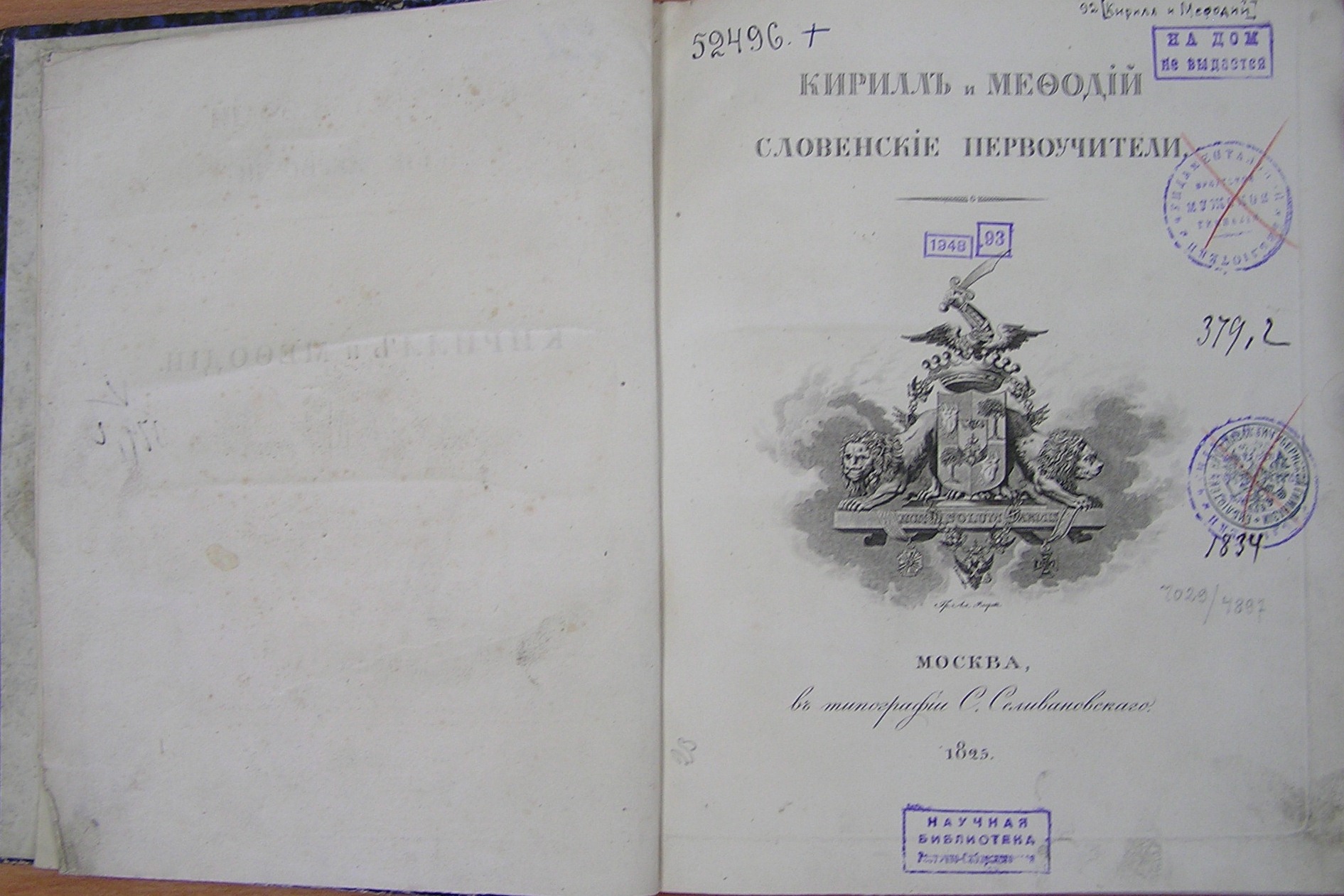 Добровский И. Кирилл и Мефодий, словенские первоучители. Историко-критическое изследование / И. Добровский ; пер. с нем. М. П. Погодина. – М. : Тип. Семена Селивановского, 1825. - VII, [1], 150, [2] с., [1] л. ил.