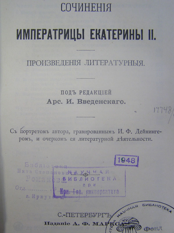 Екатерина II (императрица). Сочинения Императрицы Екатерины II : произведения литературные : с порт. автора, гравиров. И. Ф. Дейнингером, и очерком ее лит. деятельности / Екатерина II; под ред. Арс. И. Введенского. – 3-е изд. – СПб. : Изд. Т-ва А. Ф. Маркса, 1893. – 448 с. : портр., ил.