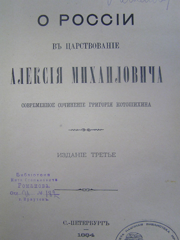 Котошихин, Г. О России в царствование Алексея Михайловича / Г. Котошихин. – Спб., 1884. – 216 с.