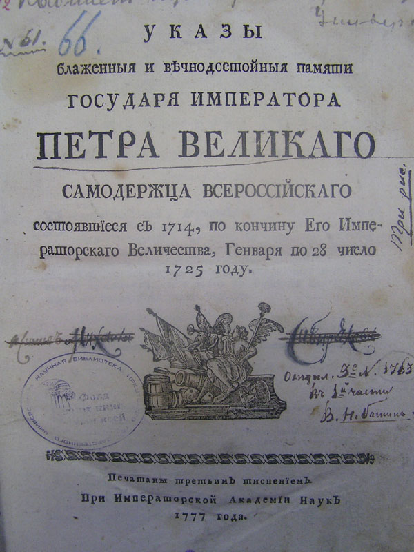 Указы блаженные и вечнодостойные памяти государя императора Петра Великого самодержца всероссийского. состоявшиеся с 1714, по кончину его императорского величества, января по 28 число, 1725 года. – СПб. : Тип. при Имп. Акад. наук, 1777. – 1095 с.
