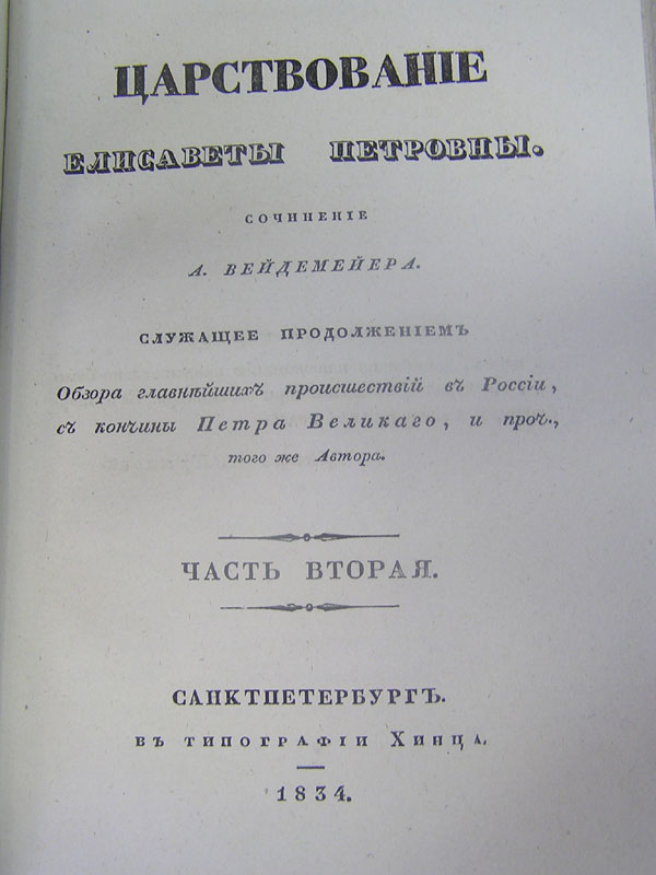 Вейдемейер, А. Царствование Елисаветы Петровны. Ч. 1 / А. Вейдемейер. – Спб. : Тип. Департамента внеш. Торговли, 1834. – 143 с.